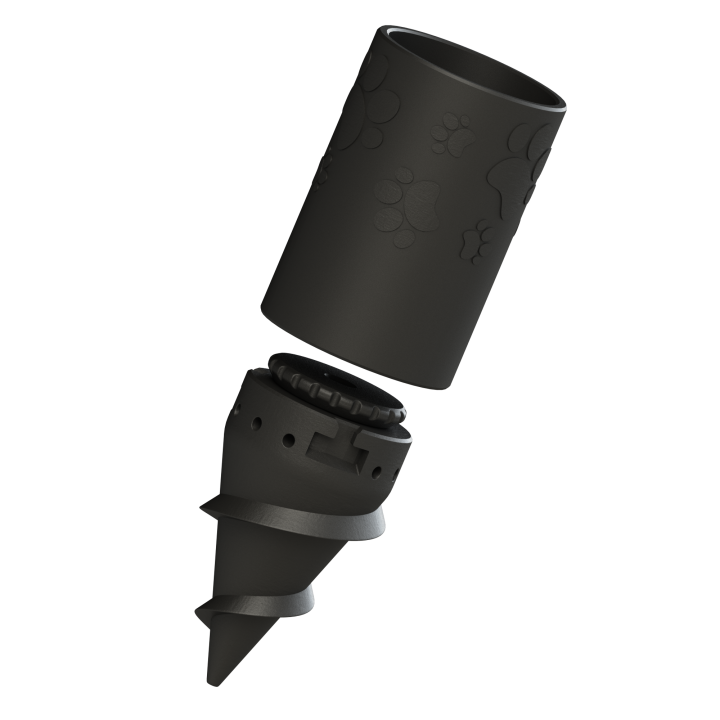 Håndtaget har form af en solid cylinder, der sættes på den øverste del af beholderen. De indvendige tapper passer præcist ind i beholderens huller, hvilket sikrer en stabil kraftoverførsel og sikker skruning uden risiko for at glide.