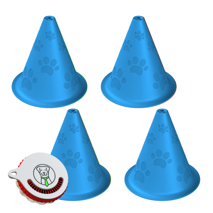 Illesztett készlet a szagképzéshez: négy edzőkúp rejtett illatkamrával és egy Fluonose Mini+ illatdoboz – minden, amire szükséged van, hogy azonnal elkezdhesd a nosework edzést a kutyáddal.