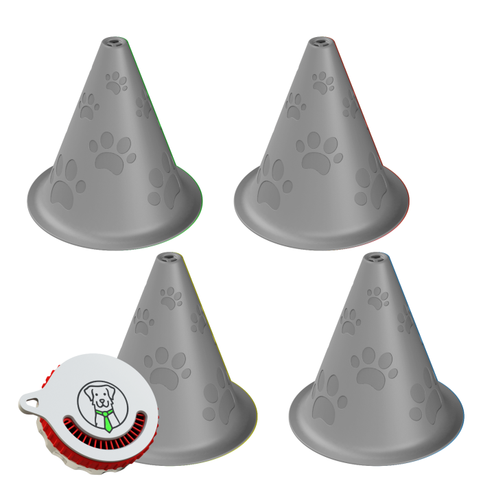 Illesztett készlet a szagképzéshez: négy edzőkúp rejtett illatkamrával és egy Fluonose Mini+ illatdoboz – minden, amire szükséged van, hogy azonnal elkezdhesd a nosework edzést a kutyáddal.