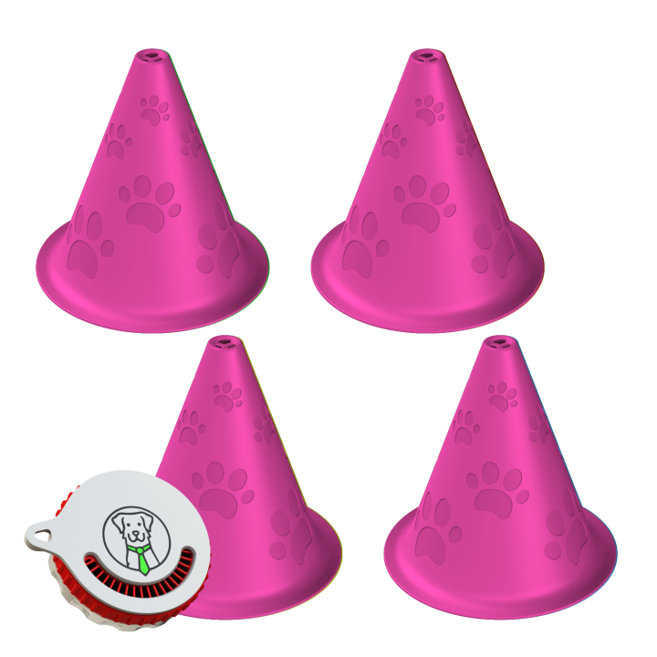 A készlet két anyagvariációban érhető el. Az IMPACT verzió kemény, tartós műanyagból készült, amely ellenáll a mechanikai sérüléseknek és az időjárási viszontagságoknak. Ez jó választás, ha a tartósság és a széles színválaszték fontos számodra – 16 szín közül választhatsz. A gumis verzió viszont egy puha gumából készült kúp, kemény műanyag dugóval. Ez valamivel rugalmasabb és puhább tapintású – különösen jól működhet azoknál a kutyáknál, akik hajlamosak játszani a kúppal, és nem csak megjelölni azt. 13 színben elérhető.