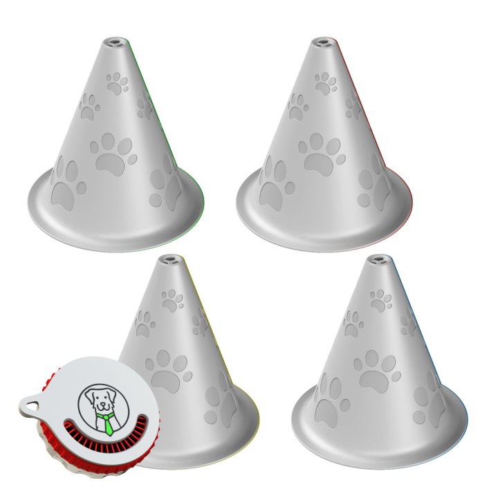 A készlet két anyagvariációban érhető el. Az IMPACT verzió kemény, tartós műanyagból készült, amely ellenáll a mechanikai sérüléseknek és az időjárási viszontagságoknak. Ez jó választás, ha a tartósság és a széles színválaszték fontos számodra – 16 szín közül választhatsz. A gumis verzió viszont egy puha gumából készült kúp, kemény műanyag dugóval. Ez valamivel rugalmasabb és puhább tapintású – különösen jól működhet azoknál a kutyáknál, akik hajlamosak játszani a kúppal, és nem csak megjelölni azt. 13 színben elérhető.
