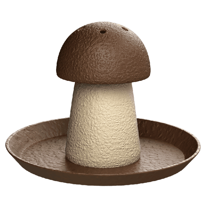 Il cappello del fungo è dotato di fori di ventilazione che consentono al profumo di diffondersi liberamente. I fori si trovano sia nella parte superiore che in quella inferiore; su richiesta è possibile realizzare una versione con fori in una sola direzione.