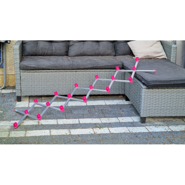 Log inAccordion Geurstrip PRO is een verbeterde versie van de opvouwbare geurstrip voor nosework – gebaseerd op een schaarmechanisme, met armen van duurzame aluminium profielen en flexibele manden voor Fluonose Nano+ blikken. Het strekt zich uit tot 2 of 3 meter in enkele seconden, en biedt een stabiele en bijna onvernietigbare geurstrip.