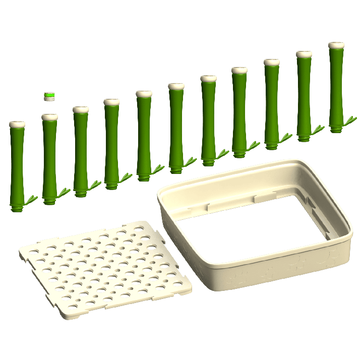 Bambussegmentene kobles sammen med solide gjenger, noe som gjør det mulig å stabilt og raskt konfigurere settet. I enden av hvert segment er det et feste for luktboksen Fluonose Nano+ (eller andre bokser med en diameter på opptil 13 mm). Den modulære innsatsen til potten har dimensjoner på 20x20 cm, og kan brukes uavhengig eller kombineres med andre moduler for å lage en større "lukteng".