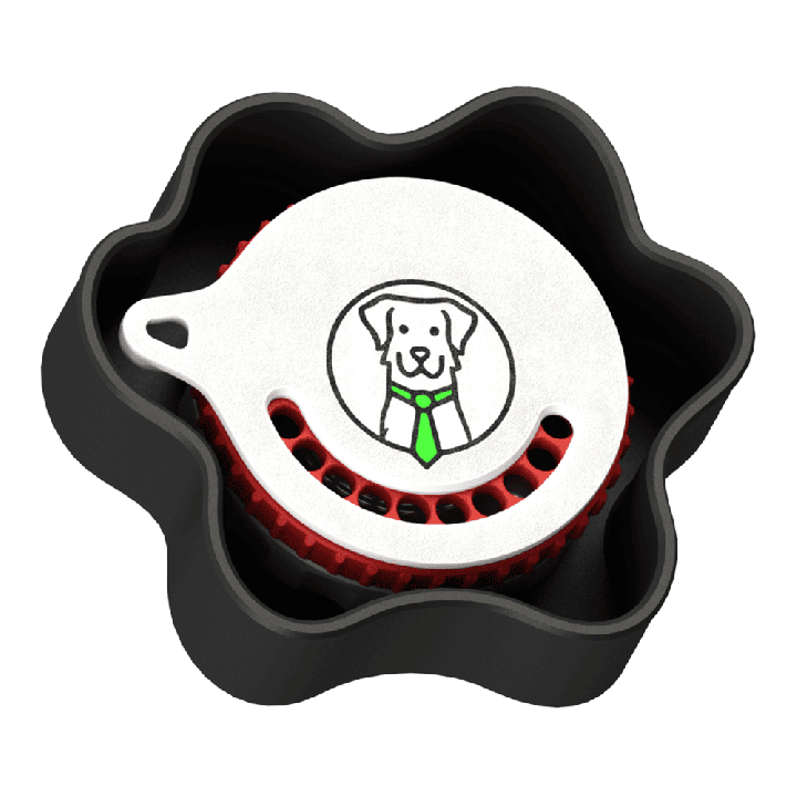 A tampa com o motivo da pata é feita na cor branca com preenchimento preto. Três orifícios de ventilação na parte superior permitem que o cheiro se libere gradualmente, tornando os exercícios mais naturais e envolventes para o cão. Dentro, cabe uma lata Fluonose Mini+ ou uma amostra de cheiro em qualquer forma (por exemplo, um algodão embebido em óleo).