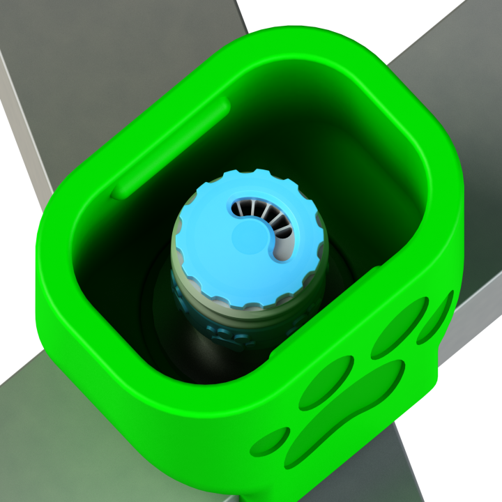 V každom uzle sa nachádza gumový koš na plechovku Fluonose Nano+, ktorý sa prispôsobuje kontajneru a tlmí kontakt s papuľou psa. 🐾 Aj pri dynamickom označovaní nič nevypadáva, nepraská a neuvoľňuje sa.