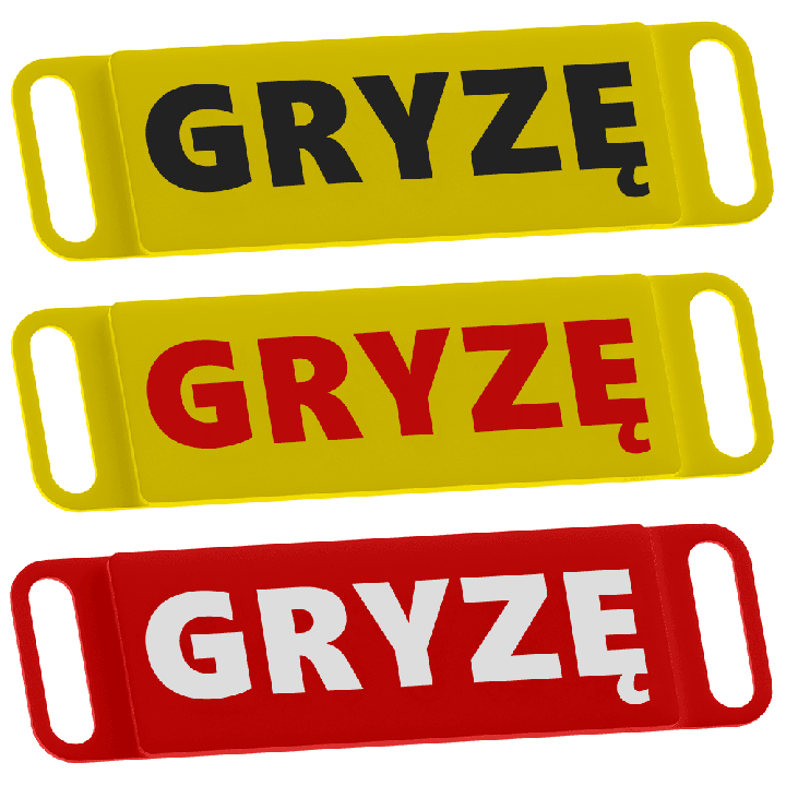Gummiskydd för halsband med texten "GRYZĘ" – ett tydligt varningsmeddelande för omgivningen! Väderbeständig, finns i olika storlekar, lätt att montera och rengöra.